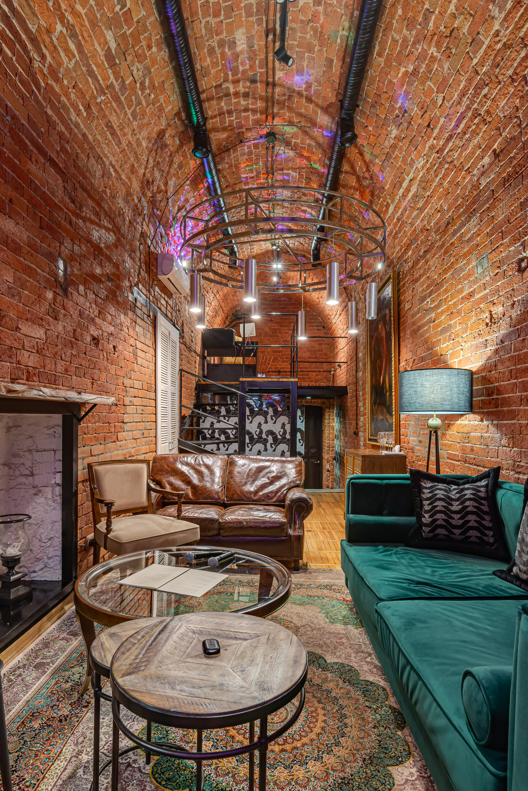 The karaoke room is made in loft style - brick walls, comfortable sofas and armchairs with bright color accents. A good place to gather a small company, sing your favorite songs and even dance.