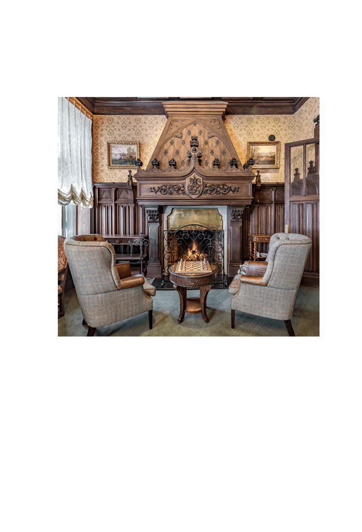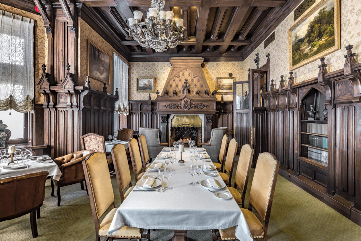 Каминный зал — второе по величине помещение в Клубе. Доминантой зала являются дровяной камин в обрамлении массивных деревянных панелей на стенах и окна в широких рамах в неоготическом стиле.